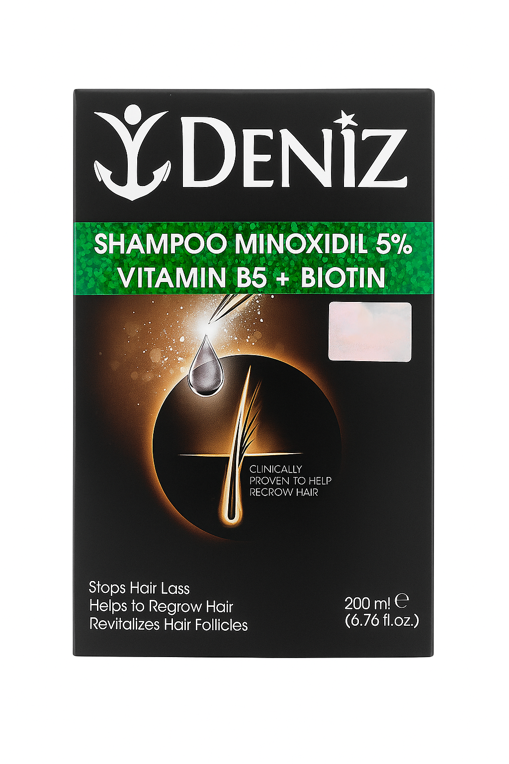 شامبو Deniz يحتوي على مينوكسيديل + فيتامين B5 + بيوتين للمساعدة في تقوية الشعر وتنشيط فروة الرأس.