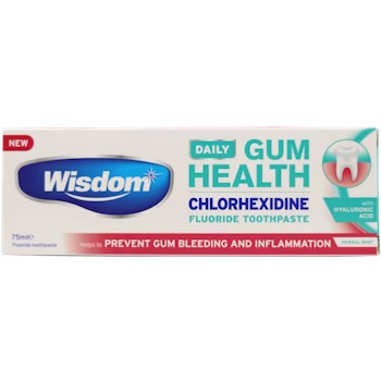 - ويوجد أيضاً في شكل غسول فموي (mouthwash) ضمن نفس الفئة ”Daily Gum Health“ أو ضمن تشكيلة “Gum Health & Chlorhexidine” لدى Wisdom.